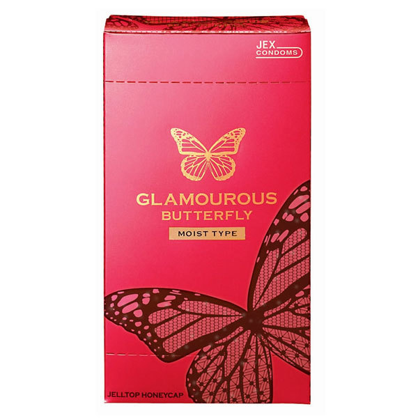 先端にマリンコラーゲン、ヒアルロン酸配合の潤いゼリー付き!流行に敏感なティーン世代の女の子達が「女性たち自身が欲しくなるコンドーム」をコンセプトに作ったお洒落コンドーム「グラマラスバタフライモイスト1000」12個入。